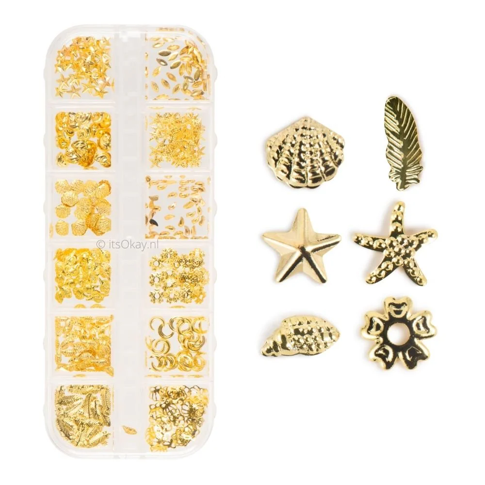 Prachtige decoraties van glanzend metaal met goudkleur. Je krijgt 12 varianten per doosje. Geschikt voor hobby en knutselen zoals epoxy resin art.Â